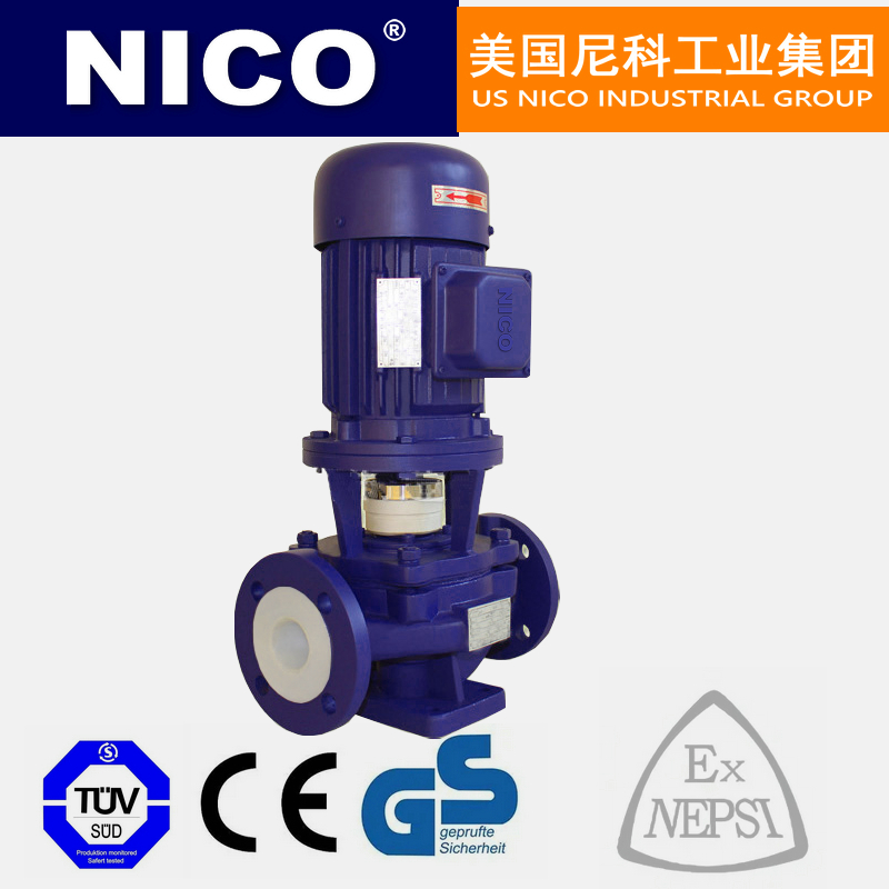 美国尼科NICO化工浓硫酸立式管道离心泵应用于80~100%的硫酸,温度可达60-80℃。钢铁在这一浓度和温度范围的硫酸中,表面能产生保护性的硫酸铁膜层。铸铁不适用于超过100%的发烟硫酸,可能是由于三氧化硫与铁中所含的硅反应,使铸铁变脆。碳钢不适用于 100~102%的发烟硫酸,超过102%的酸则又适用,温度限定约为60℃。稀硫酸对钢铁的腐蚀很大,当酸浓度为47%左右时,腐蚀率达到最高值。当酸浓度大于65%时,钢铁的腐蚀率显著降低。但是在65~80%这一段浓度中,最好还是不使用钢铁,以用铅或其它耐稀酸材料更为安全。