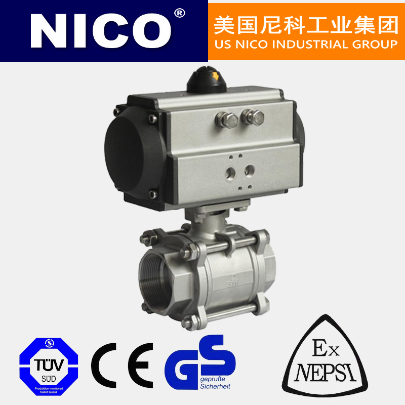 美国尼科NICO进口气动三片式球阀是由气动执行器与三片式球阀组成,利用压缩空气作为能源,接受气动信号或电气定位器等附件信号进行工作,具有结构简单、操作方便等优点。提高了使用寿命,气缸内输入气压后,作用于活塞上产生一定的推力,使齿轮型输出在活塞推动下,使齿轮输出轴于旋转,带动阀轴转动,从而使球阀球体在阀内随着转动,广泛应用于生产过程自动控制系统中的调节或开关操作场合。