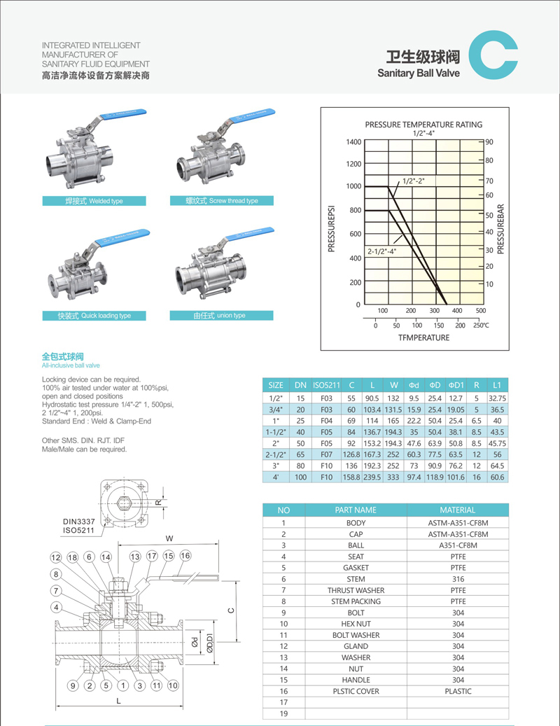 美国尼科NICO进口卫生级双活接由令球阀,也叫由壬球阀、由任球阀,有二片式,三片式,三通L型,三通T型,采用不锈钢304SS或者316材质,标准电子抛光,光滑表面确保清洁,无介质积存区域,不会产生潜在的污染,可以满足食品、生物制药领域各种介质的特殊要求。尼科NICO卫生级气动球阀其光滑、无缝、自动排空手工艺流体通道还非常适用于蒸汽踏它就地清洗的需要。在制造加工过程中严格按FDA要求进行质量临控,采用电脑三维设计,是为GMP要求而制造的。