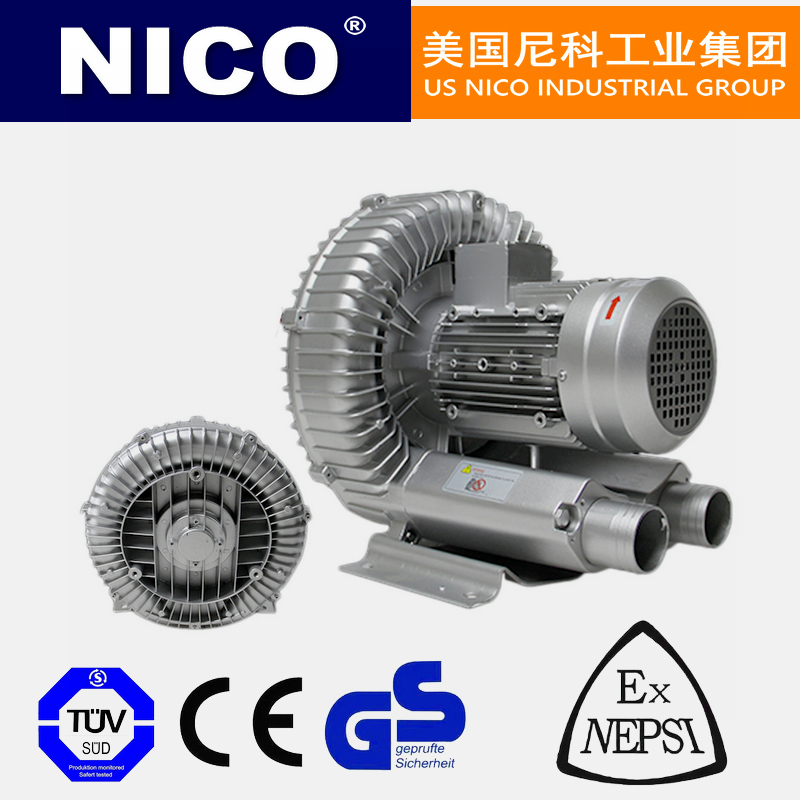 美国尼科NICO进口静音鼓风机结构新颖,马达被带隔音材料的保护套所隐藏并用在同一边的空气进气口来冷却马达,绝缘性能强,安装容易,稳定性高,通过的气体无油、干燥,高品质,旋涡风机工作时,动力机(主要是电动机)驱动叶轮在蜗形机壳内旋转,空气经吸气口从叶轮中心处吸入。以减少风机运行时的震动,降低噪音,增加风机的使用寿命,由于叶片对气体的动力作用,气体压力和速度得以提高,并在离心力作用下沿着叶道甩向机壳,从排气口排出。高压风机在运行的过程中可以免维护使用,其磨损的部分只有两个轴承,在质量保证期内,基本上不需要维护,因气体在叶轮内的流动主要是在径向平面内,故又称径流风机。高压风机采用宽频,宽压电机,单相110V/230V 工业三相:220/380/415/660V等。