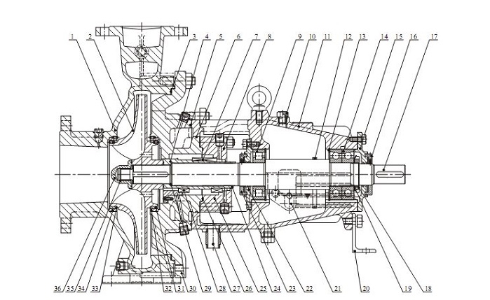 | 1.泵体 | 8、25密封盖 | 15、22轴承压盖 | 21油杯 | 36叶轮螺母 |