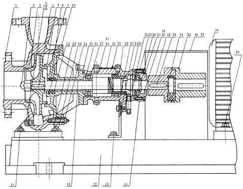 1、基本结构为单级单吸悬臂支脚,泵吸入轴向吸入,排出中心垂直,与电机安装在同一底座上。