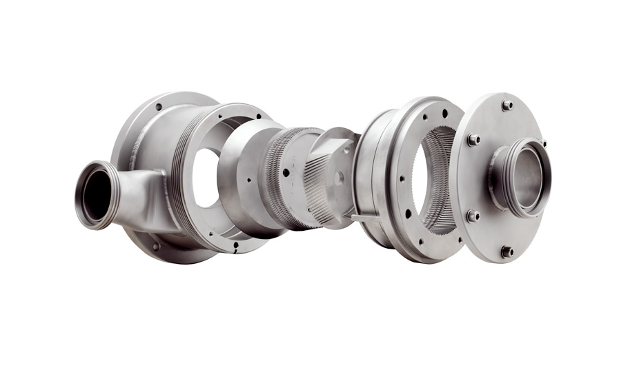 2、管线式胶体磨的磨头结构:沟槽的结构式斜齿,每个磨头的沟槽深度不一样,并且斜齿的流道的体积从上往下是从大到下,而国内胶体磨的斜齿的每个磨头的沟槽深度一样,流道体积是一样大,这样形成了本质的区别。我们可以保证物料从上往下一直在进行研磨,而他们只能在一级磨头到另外一级磨头形成研磨效果。