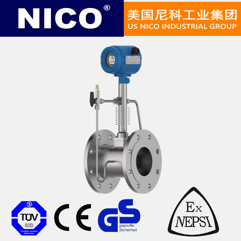 美国尼科NICO进口蒸汽流量计是利用液体振动原理而开发的一种新型流量计,该流量计无可动部件,可靠性强、精度高、寿命长,可在很宽的流量范围内精确测量液体的瞬时流量和累计流量。其不受介质温度、压力、粘度及组分的影响,同时不堵、不卡、不易结垢、耐高温、高压,安全防爆,适用于恶劣环境。蒸汽流量计带温度和压力补偿的目的是当体积偏离实际流量时,密度补偿可以很好地修正结果。蒸汽处于气态,其密度随温度和压力本身的变化而变化。如果没有补偿会造成巨大的错误。涡街质量流量计是蒸汽流量测量中的绝技。特别是支持高达 350°C(662°F)的高温,并且可以测量非常低的流量。流量计分一体化显示和远传显示,并可输出脉冲信号或电流信号与微机联网。