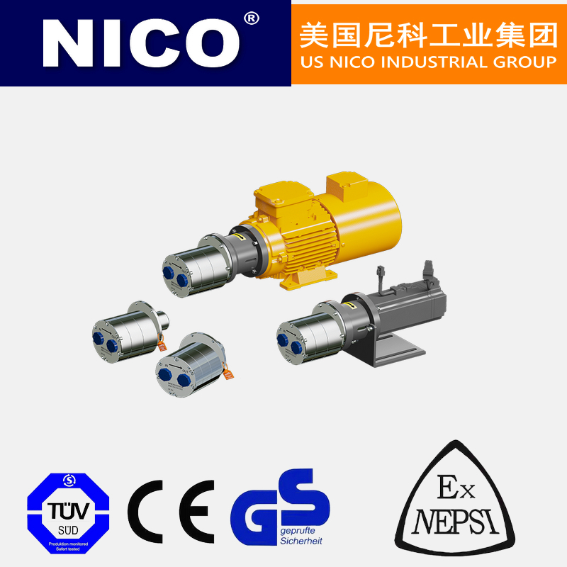 美国尼科NICO进口高温齿轮泵由马达、减速器、联轴器和泵头几部分组成,泵头部分由泵壳、前后侧盖、齿轮···
