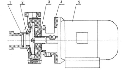 | 1 | 泵壳 | 2 | 叶轮-轴总成 | 3 | 机械密封 | 4 | 泵盖 | 5 | 电机 |