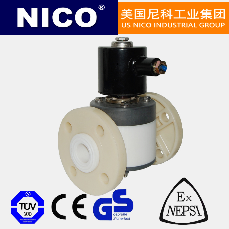 美国尼科NICO进口塑料电磁阀有多种材质可选,包含ABS、PTFE、UPVC、VPVC,PA66材质,是腐蚀性介质管道控制系统中的理想产品。该阀采用先导式控制方式,提供法兰(法兰材质可选用不锈钢或塑料防腐材质)、螺纹连接方式可选择,并可附加信号反馈,通径范围DN1~DN50多种规格可选。在酸、碱、盐、苯酚、甲醛、丁烷等几乎所有化学介质自控系统中均可应用。