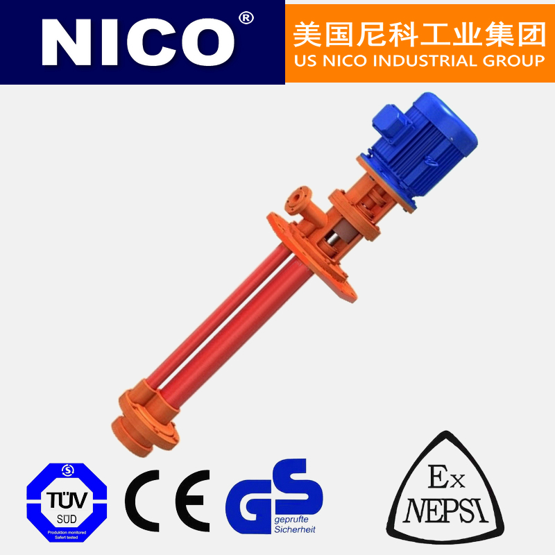 美国尼科NICO进口玻璃钢液下泵该泵因伸入贮罐,贮槽的深度长短不同,设计液下深度800mm--3000mm之间任意选择。只要液体高于泵体,即可不灌液而起动送液,平盖板下设有泄漏孔,液体不会向贮罐外泄漏。进口玻璃钢液下泵与介质接触的零部件,美国尼科NICO系用聚乙烯醇缩丁醛改性酚醛玻璃纤维,经高温模压成型的酚醛玻璃钢制件,联接管、出液管采用半干法卷制工艺制成的酚醛玻璃钢管,叶轮轴套的装配均用酚醛胶泥和泵轴粘成一体,液下各部装配均用酚醛胶泥粘结,伸入液下全无金属与介质接触,耐腐性能绝对可靠,产品具有轻质、高强、不变形、耐温、耐腐蚀等优良性能,在防腐方面可部分替代含钼不锈钢、钛及钛合金等贵重金属。泵在传动和旋转方向:泵通过爪型弹性联轴器由电动机直接驱动,从电动机端看泵为顺时针方向旋转。