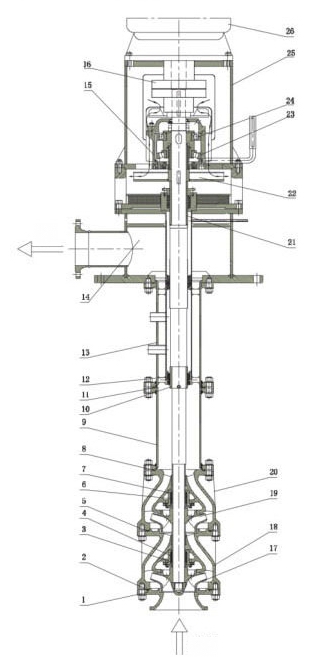 | 13 | 上接管 | 14 | 压水段 | 15 | 传动组件 | 16 | 联轴器 | 17 | 叶轮 | 18 | 泵体 |