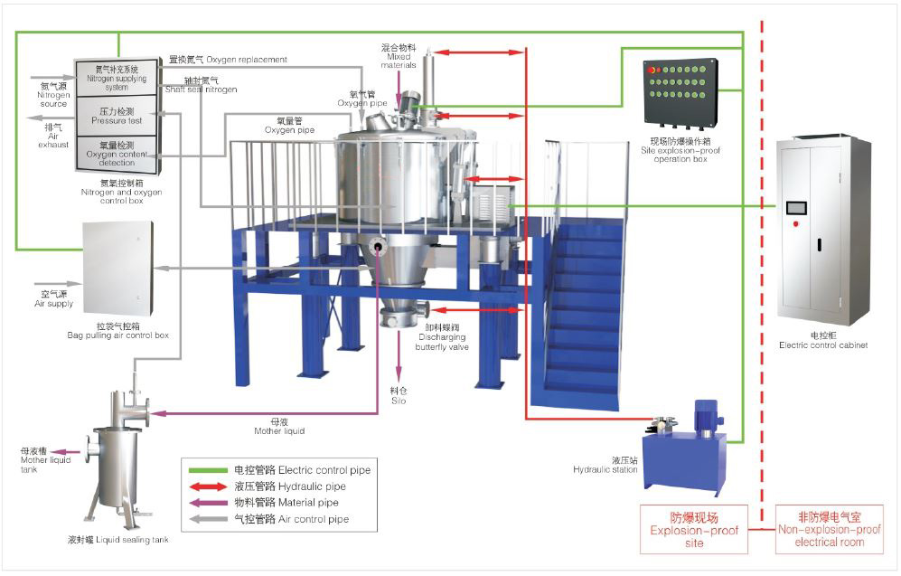 T4、T5、T6防爆型卸料离心机采用防爆标准制作,在离心机主机开启前进行大流量氮气置换。通过氧气含量检测、压力检测等途径确保离心机机内气体惰性化,满足离心机运行要求。设备运行后,动态监测氧气含量,进行大流量氮气置换或小流量低压氮气补充,确保设备的隔爆运行要求。